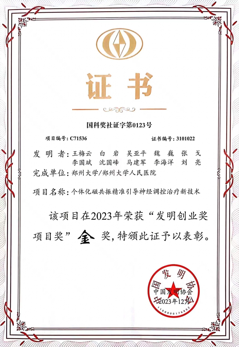 近日,2022-2023年“發(fā)明創(chuàng)業(yè)獎(jiǎng)項(xiàng)目獎(jiǎng)”和“一帶一路”暨金磚國家技能發(fā)展與技術(shù)創(chuàng)新大賽頒獎(jiǎng)典禮及優(yōu)秀項(xiàng)目主題展覽在北京隆重召開,鄭州大學(xué)王梅云教授憑借個(gè)體化磁共振精準(zhǔn)引導(dǎo)神經(jīng)調(diào)控治療關(guān)鍵核心技術(shù)上的突破,榮獲2023年中國唯一一個(gè)世界知識(shí)產(chǎn)權(quán)組織最佳女性發(fā)明獎(jiǎng),同時(shí),她帶領(lǐng)項(xiàng)目團(tuán)隊(duì)獲得中國發(fā)明協(xié)會(huì)“發(fā)明創(chuàng)業(yè)獎(jiǎng)項(xiàng)目獎(jiǎng)”金獎(jiǎng)。