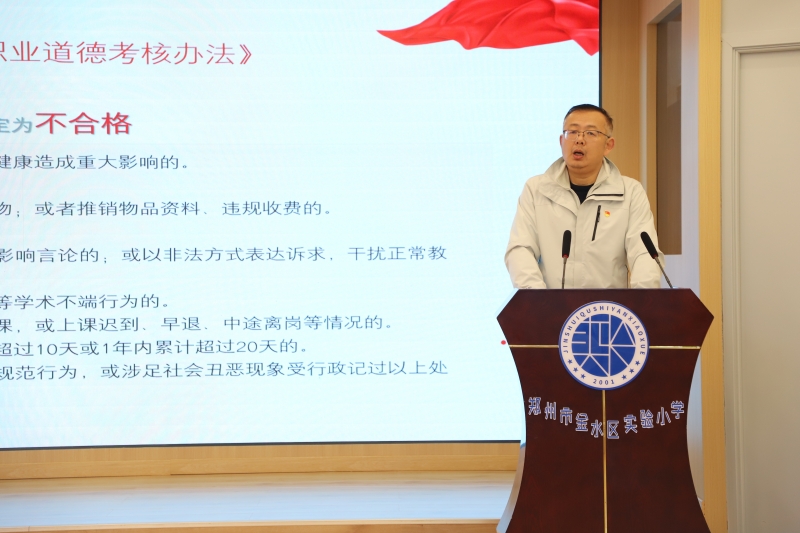 學(xué)校黨支部副書記宋偉帶領(lǐng)全校教師重溫《鄭州市中小學(xué)、幼兒園教師職業(yè)道德考核辦法》,明確師德考核內(nèi)容,指出做一名合格、優(yōu)秀教書的努力方向,引導(dǎo)各位教師繼續(xù)樹立高尚的職業(yè)理想,不斷提高思想政治素質(zhì)和職業(yè)道德水平,不斷提升人格修養(yǎng)和學(xué)識修養(yǎng),增強教書育人的榮譽感和使命感。