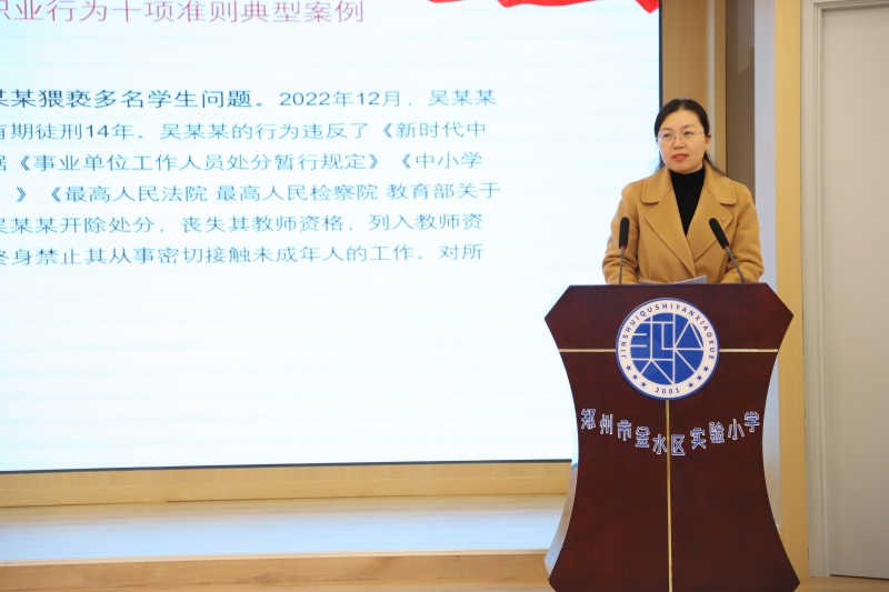 學(xué)校德育主任張麗娟帶領(lǐng)全體教師學(xué)習(xí)《教育部公開曝光7起違反教師職業(yè)行為十項準(zhǔn)則典型案例》,結(jié)合典型案例,誡勉全體教師嚴(yán)格遵守教師行為準(zhǔn)則,規(guī)范執(zhí)教行為,做時刻自重、自省、自警、自勵,做以德立身、以德立學(xué)、以德施教的好老師。