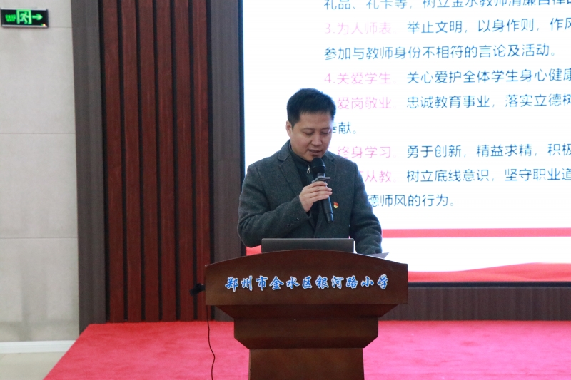 伴隨著祥龍迎春的腳步,滿載憧憬與希望的新學(xué)期如期而至。為進(jìn)一步加強(qiáng)學(xué)校師德師風(fēng)建設(shè),激勵(lì)廣大教師以飽滿的熱情積極投入到教育教學(xué)工作。根據(jù)上級(jí)工作部署,結(jié)合學(xué)校的實(shí)際情況,2024年2月26日,鄭州市金水區(qū)銀河路小學(xué)組織全體教職工以“立師德 正師風(fēng) 強(qiáng)師能”為主題開展了師德教育活動(dòng)。