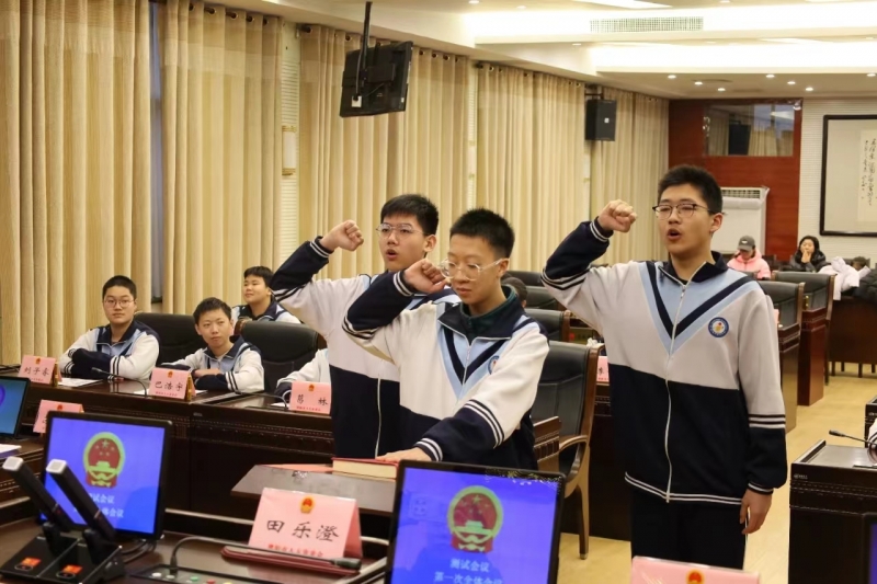 “我宣誓:忠于中華人民共和國(guó)憲法,維護(hù)憲法權(quán)威,履行法定職責(zé)……”在模擬召開(kāi)的常委會(huì)會(huì)議上,3名同學(xué)扮演國(guó)家機(jī)關(guān)工作人員,任命被通過(guò)后他們進(jìn)行了宣誓,錚錚誓言在整個(gè)會(huì)場(chǎng)回蕩。