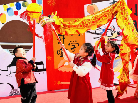 此次活動分為“龍鼓鳴志”“福龍?zhí)聿省薄叭ぼS龍門”“龍舞飛揚(yáng)”“齊樂龍龍”五大篇章,以沉浸式的開園儀式為新學(xué)期增添了一抹亮彩。