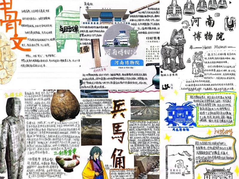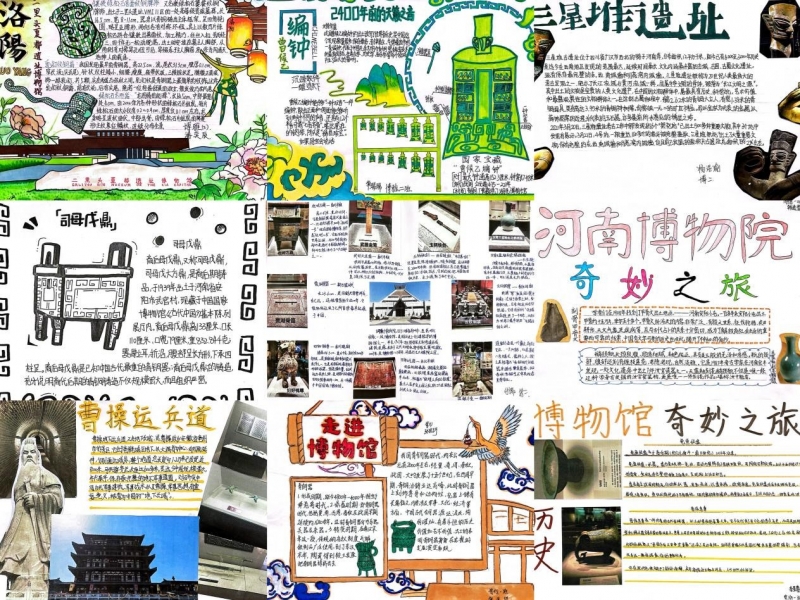 文物或許默默無言,但我們知道,它們有著獨特的心聲。老師號召同學們用歷史小報的形式圖文并茂地展示自己的博物館奇妙之旅。同學們?yōu)樽寶v史小報增添更多生動的元素,紛紛走進二里頭博物館、河南博物院、三星堆遺址等各大博物館,或聆聽講解員的精彩講解,或駐足展品前細心觀察,或翻閱資料深入了解,用心感受著歷史的厚重和文化的瑰麗。