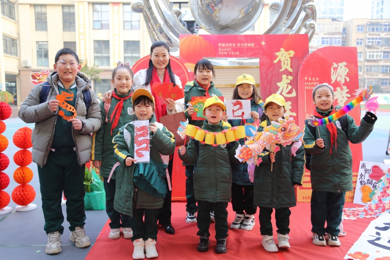 在學校門口,校園吉祥物“文文”、“源源”和龍年新春玩偶便為孩子們帶來儀式感滿滿的新學期祝福。浸潤著靈感與創(chuàng)新的寒假優(yōu)秀實踐作品展也彰顯了孩子們對龍年的美好期待,同時也彰顯出學校“雙減”下素質(zhì)教育的成果。