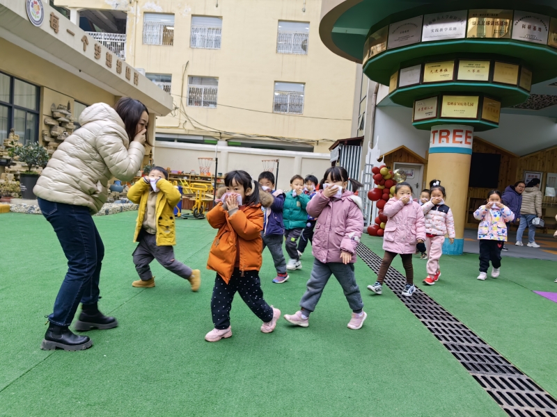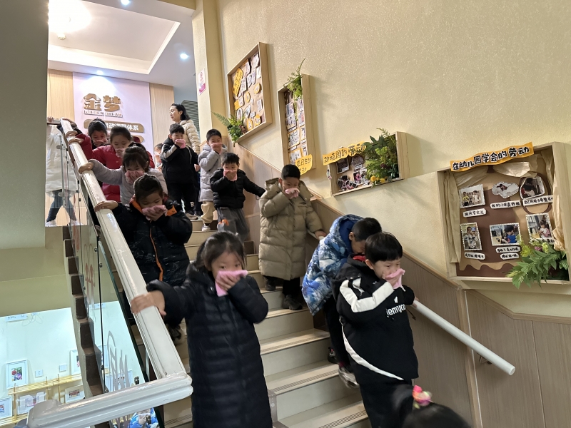 消防演練開始后,班級老師迅速組織孩子們站隊清點人數(shù),保育老師快速將打濕的毛巾發(fā)給孩子,并帶領(lǐng)孩子用濕毛巾捂住口鼻,彎腰俯身,按照預(yù)定應(yīng)急疏散逃生路線進(jìn)行緊急撤離,班主任站孩子隊伍最前面,配班老師站孩子隊伍中間,保育老師站隊尾,確保關(guān)注到每一個孩子。全園幼兒及教師撤離到安全地帶用時3分15秒。