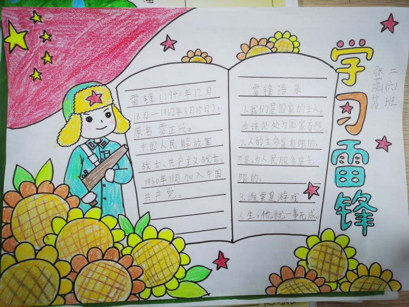 此外學(xué)生們也閱讀了有關(guān)雷鋒的書籍、觀看了關(guān)于雷鋒的影片,或利用班隊(duì)會在班級舉行“雷鋒故事分享會”,感受了鮮活的雷鋒形象。也有不少學(xué)生尋訪各行各業(yè)涌現(xiàn)出來的雷鋒式楷模榜樣,并拍攝其照片或把自己的收獲制成一期手抄報(bào),孩子們用滿滿創(chuàng)意畫雷鋒、畫英雄,繪出滿懷民族自豪與驕傲的畫卷。
