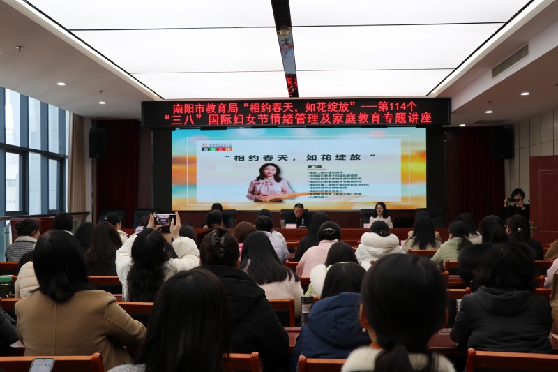 春光明媚,惠風(fēng)和暢。為慶祝第114個“三八”國際婦女節(jié),3月8日上午,南陽市教育局以“相約春天,如花綻放”為主題,特邀國家二級心理咨詢師、河南省教育廳家庭教育講師團(tuán)核心講師、南陽市著名家庭教育專家郭飛霞做專題講座,讓局屬教育系統(tǒng)女同志過了一個別開生面、內(nèi)涵豐富、意義深刻的節(jié)日。南陽市教育局黨組成員、副局長龍云飛主持會議;市委教育工委專職委員李莉出席并講話;市教育局機關(guān)、局屬單位女同志和局屬各學(xué)校(幼兒園)女職工代表參加會議。