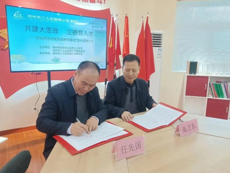 3月11日,鄭州師范學院馬克思主義學院與二七區(qū)隴西小學合作簽約儀式在二七區(qū)隴西小學南校區(qū)舉行。鄭州師范學院馬克思主義學院院長任先國、副院長范會平、實驗與實踐中心主任朱紅偉、思政課教師張嘉欣、楊麗寧、思想政治教育專業(yè)學生代表與二七區(qū)隴西小學教育集團校長張衛(wèi)東、南校區(qū)執(zhí)行校長陳朝艷、隴西小學南校區(qū)全體行政人員等參加了簽約儀式。