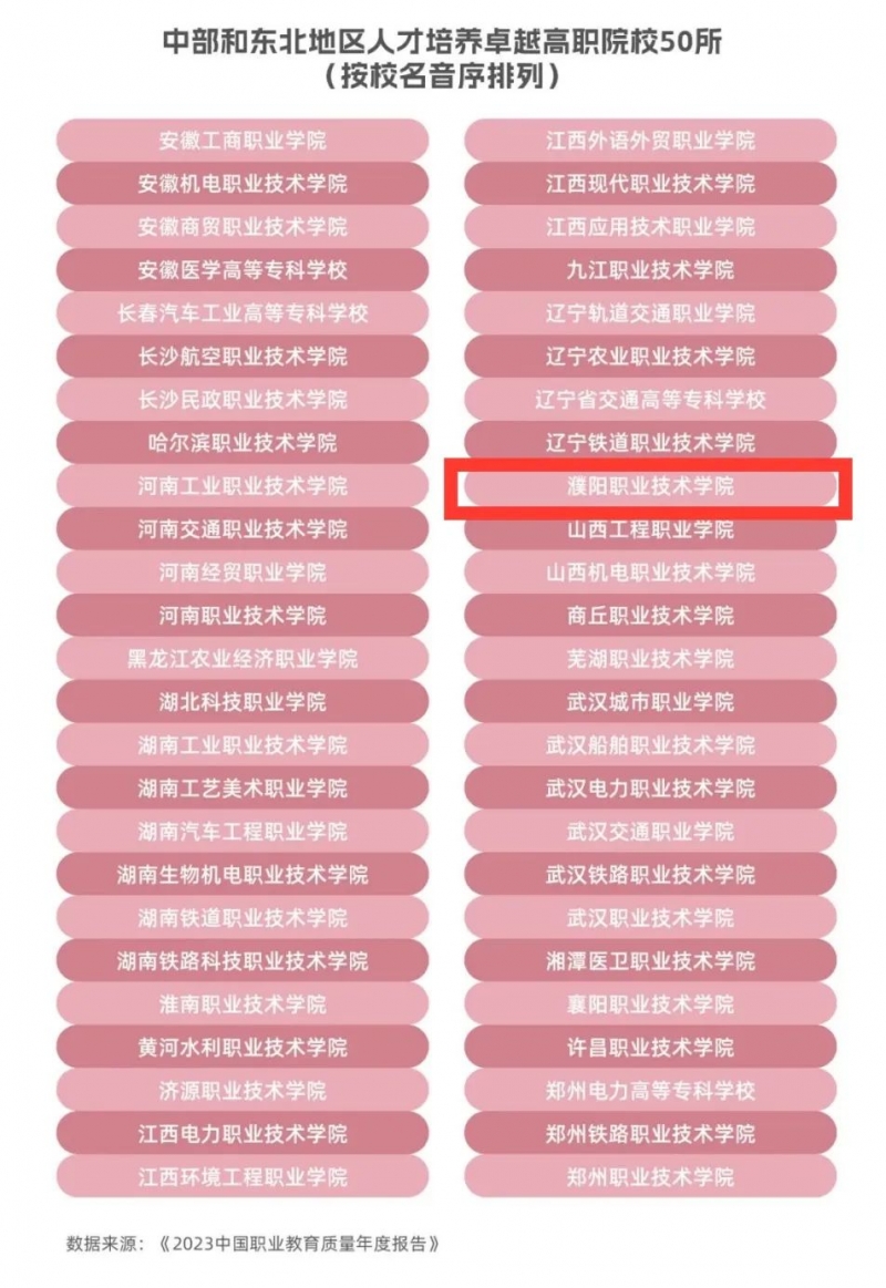 由中國(guó)教育科學(xué)研究院編著、高等教育出版社出版的《2023中國(guó)職業(yè)教育質(zhì)量年度報(bào)告》,發(fā)布了2023年?yáng)|部地區(qū)、中部和東北地區(qū)、西部地區(qū)各50所人才培養(yǎng)卓越高職院校名單,河南共計(jì)12所院校入圍,濮陽(yáng)職業(yè)技術(shù)學(xué)院位列其中。 年度報(bào)告基于職業(yè)教育的人才培養(yǎng)投入、過程和成果相關(guān)指標(biāo)數(shù)據(jù),采用因子分析法確定指標(biāo)權(quán)重,對(duì)高等職業(yè)學(xué)校人才培養(yǎng)投入(包括辦學(xué)條件、師資隊(duì)伍和教學(xué)資源等3項(xiàng)二級(jí)指標(biāo))、人才培養(yǎng)過程(包括專業(yè)設(shè)置、技能培養(yǎng)和教學(xué)評(píng)價(jià)等3項(xiàng)二級(jí)指標(biāo))和人才培養(yǎng)成果(包括技能水平、創(chuàng)新能力、就業(yè)質(zhì)量和職業(yè)發(fā)展等4項(xiàng)二級(jí)指標(biāo))三大維度的34項(xiàng)末級(jí)指標(biāo)觀測(cè)點(diǎn),綜合計(jì)算得出東部地區(qū)、中部和東北地區(qū)、西部地區(qū)各50所人才培養(yǎng)卓越高等職業(yè)學(xué)校。 此次濮陽(yáng)職業(yè)技術(shù)學(xué)院入圍人才培養(yǎng)卓越高職院校榜單,充分展現(xiàn)了我校“雙高”建設(shè)的成效。下一步,學(xué)校將持續(xù)推進(jìn)職普融通、產(chǎn)教融合、科教融匯,深化現(xiàn)代職業(yè)教育體系建設(shè)改革,提升地區(qū)服務(wù)能力和辦學(xué)育人水平,推動(dòng)學(xué)校各項(xiàng)事業(yè)高質(zhì)量發(fā)展。