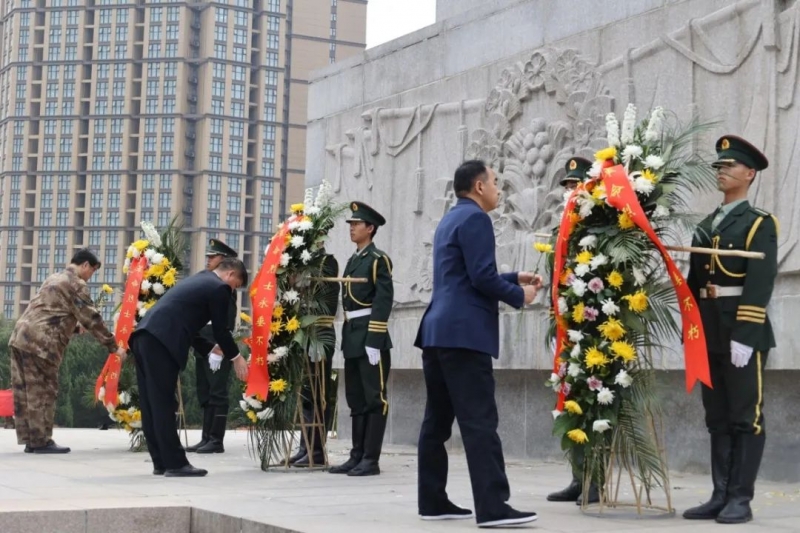 在《獻花曲》的伴奏下,6名國旗護衛(wèi)隊隊員向革命烈士紀念碑敬獻花籃,共青團市委副書記馬慶華、鄭州市教育局宣外處處長雷剛、鄭州市國防科技學校校長張凱共同上前整理挽聯(lián)。儀式結束后,全體與會人員依次緩步繞行,瞻仰烈士紀念碑,并追思他們英勇無畏、不怕犧牲的革命精神。