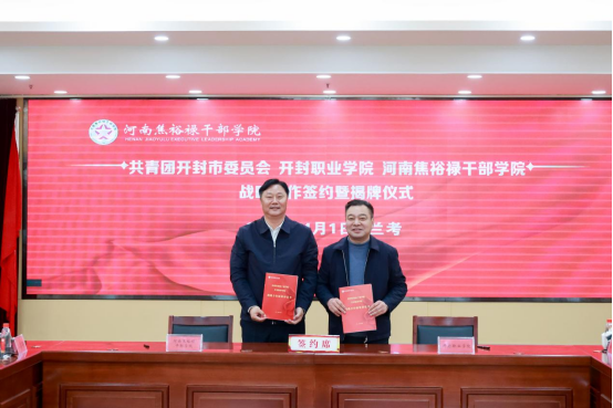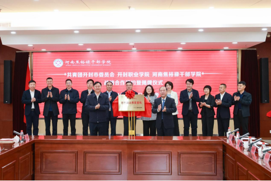 儀式上,徐仲昆和文柏松分別代表開封職業(yè)學院、焦裕祿干部學院簽訂戰(zhàn)略合作框架協議書;儲建新與文柏松共同為“開封職業(yè)學院思政教育基地”揭牌;孫楠與劉巖共同為“焦裕祿精神青年學校”揭牌。
