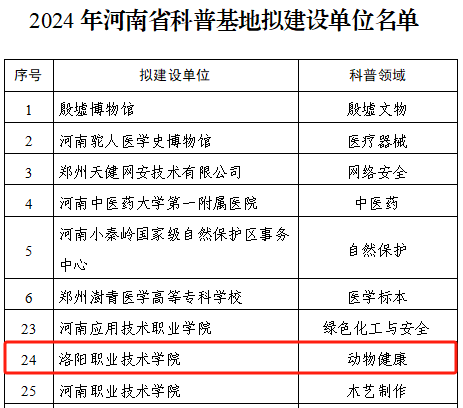 河南省科技廳2021年起啟動河南省科普基地建設,旨在樹立科普載體標桿,打造科普品牌,充分發(fā)揮科普載體的宣教優(yōu)勢,提升公眾科學素質。經(jīng)單位申請、主管部門審核推薦、專家評審論證、實地考察等程序,最終確定40家單位作為2024年河南省科普基地擬建設單位,洛陽職業(yè)技術學院動物與人類健康科普基地成功入選。