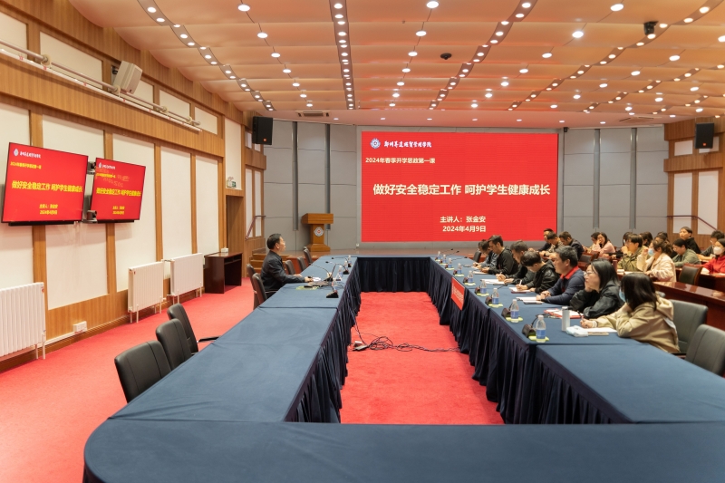 4月9日下午,鄭州升達(dá)經(jīng)貿(mào)管理學(xué)院黨委副書記、副校長張金安以《做好安全穩(wěn)定工作,呵護(hù)學(xué)生健康成長》為題,在國際會(huì)議廳為金貿(mào)學(xué)院、外語學(xué)院、建工學(xué)院、體育學(xué)院學(xué)生工作者上了一堂生動(dòng)的春季學(xué)期開學(xué)思政第一課。四個(gè)學(xué)院黨委書記鐘江鴿、石皓召、韓炎濤、李松濤和行政秘書及全體輔導(dǎo)員參加了學(xué)習(xí)。