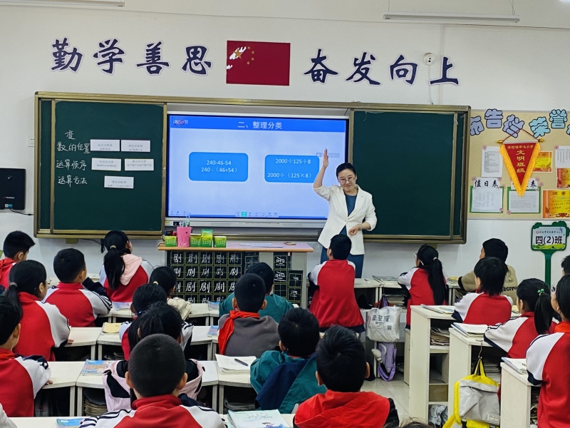 數(shù)學(xué)教師周潔執(zhí)教的是四年級(jí)數(shù)學(xué)課《運(yùn)算律》復(fù)習(xí)。她引導(dǎo)學(xué)生創(chuàng)編故事進(jìn)入學(xué)習(xí)情境,以畫圖的形式來(lái)解釋運(yùn)算律,并在課上進(jìn)行展示,學(xué)生們?cè)谙嗷サ慕涣髦屑由盍藢?duì)運(yùn)算律的理解。為了化解學(xué)習(xí)難點(diǎn),周老師用孫悟空打妖怪的情景幫助學(xué)生進(jìn)一步厘清乘法分配律的特征。最后,周老師和孩子們一起探究運(yùn)算律的作用,使學(xué)生感受到運(yùn)算律不僅可以用來(lái)簡(jiǎn)便運(yùn)算,還是確定算理和算法的重要依據(jù),從而打通了知識(shí)的內(nèi)在聯(lián)系,培養(yǎng)學(xué)生的思維力。