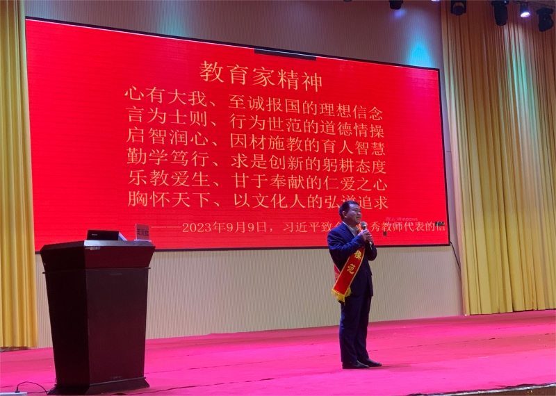 在報(bào)告會(huì)上, 張玉滾以《弘揚(yáng)教育家精神,爭做時(shí)代“大先生”》為題,結(jié)合工作經(jīng)歷,滿懷深情地講述了自己作為一名共產(chǎn)黨員和人民教師,扎根偏僻山村20余年,愛護(hù)學(xué)生、專心教學(xué)、默默堅(jiān)守在基層教育一線的經(jīng)歷和事跡,生動(dòng)詮釋了育人崇德、師者匠心的深刻內(nèi)涵。他誓言要和各位教師一起努力提高綜合素質(zhì),大力弘揚(yáng)教育家精神,樹立“躬耕教壇,強(qiáng)國有我”的志向和抱負(fù),用大愛書寫教育人生,為鄉(xiāng)村教育振興貢獻(xiàn)力量。