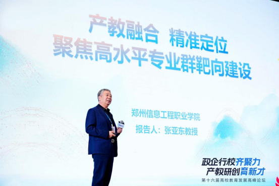 會議以“政企行校齊聚力,產(chǎn)教研創(chuàng)育新才"為主題,邀請了國內(nèi)各大高校教育專家、數(shù)字產(chǎn)業(yè)專家及高技能人才、一線骨干教師、企業(yè)家、學(xué)者等眾多嘉賓參會,共同探討高校教育的產(chǎn)教融合、人才培養(yǎng)、教育創(chuàng)新,分享人才培養(yǎng)成果及優(yōu)秀實(shí)踐案例。鄭州信息工程職業(yè)學(xué)院作為六所代表學(xué)校之一,張亞東教授在會議上作題為“產(chǎn)教融合·精準(zhǔn)定位· 聚焦高水平專業(yè)群靶向建設(shè)”的主題報(bào)告。