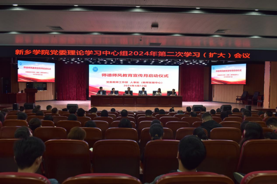4月12日下午,新鄉(xiāng)學(xué)院黨委理論學(xué)習(xí)中心組2024年第二次學(xué)習(xí)(擴(kuò)大)會(huì)議暨師德師風(fēng)教育宣傳月啟動(dòng)儀式在文化藝術(shù)中心舉行。黨委書記孫功奇,校長(zhǎng)王孝俊,黨委副書記、工會(huì)主席高煒,副校長(zhǎng)韓輝、楊鈞、張銀堂出席會(huì)議。全體中層干部,馬克思主義學(xué)院、教育科學(xué)學(xué)院、附屬中學(xué)全體教師,師范專業(yè)教師代表參加學(xué)習(xí)。