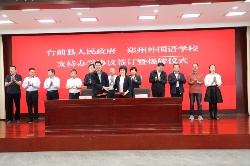 4月21日,臺前縣人民政府與鄭州外國語學(xué)校舉行支持辦學(xué)協(xié)議簽訂暨揭牌儀式。鄭州外國語學(xué)校校長王曉強(qiáng)、副校長周劍,臺前縣委副書記、縣長李志華,副縣長王秋英等出席儀式,臺前縣委教育工作領(lǐng)導(dǎo)小組成員單位相關(guān)負(fù)責(zé)同志參加儀式。儀式由濮陽市教育局黨組成員、副局長齊永軍主持。