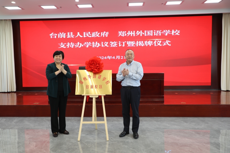王秋英與周劍作為雙方代表簽訂支持辦學(xué)協(xié)議。王曉強(qiáng)和李志華共同為“鄭州外國語學(xué)校臺前校區(qū)”揭牌。