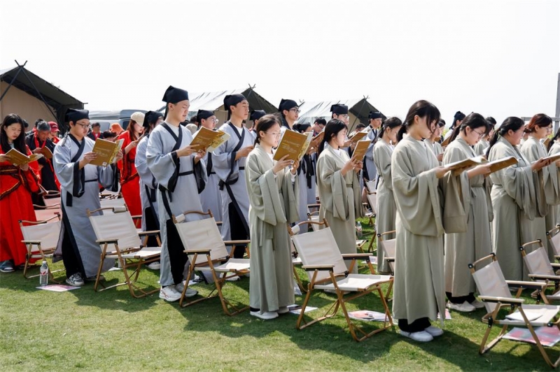 “子曰:‘弟子入則孝,出則弟。’”在劉庵村村民李燁的帶領(lǐng)下,200余名師生代表、群眾代表一起誦讀《論語》及《禮記》中的經(jīng)典章節(jié),共同領(lǐng)略古典文化的韻律之美。全體人員沉浸在書香的海洋中,感受著經(jīng)典的深邃與博大。