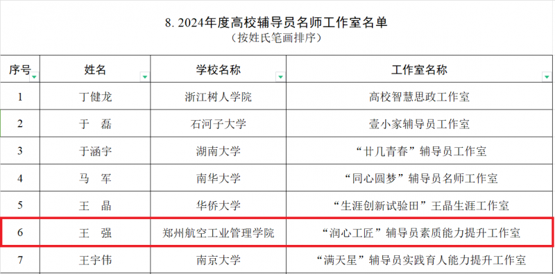 近日,教育部公布《2024年度高校思想政治工作質(zhì)量提升綜合改革與精品建設(shè)項(xiàng)目入選名單的通知》(教思政廳函〔2024〕6號(hào)),鄭州航空工業(yè)管理學(xué)院王強(qiáng)主持建設(shè)的“潤(rùn)心工匠工作室”成功入選國(guó)家級(jí)輔導(dǎo)員名師工作室,此次系教育部首次評(píng)選全國(guó)高校輔導(dǎo)員名師工作室(全國(guó)80項(xiàng),河南省3項(xiàng))。
