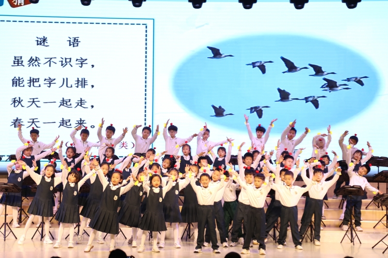 小鐘琴社團(tuán)的一曲《上春山》為本次活動拉開帷幕,英語社團(tuán)的孩子們演繹經(jīng)典繪本劇《好餓好餓的毛毛蟲》,親子詩朗誦《英雄》、師生詩朗誦《祖國頌》,以及青年教師代表帶來的《仰望星空》一次又一次地將整場氛圍推向高潮。