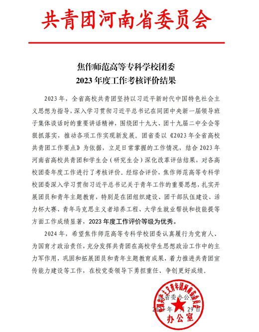 近日,共青團(tuán)河南省委通報(bào)了全省高校共青團(tuán)2023年度工作考核評價(jià)結(jié)果,焦作師范高等專科學(xué)校共青團(tuán)工作在考核評價(jià)中獲評“優(yōu)秀”等級。