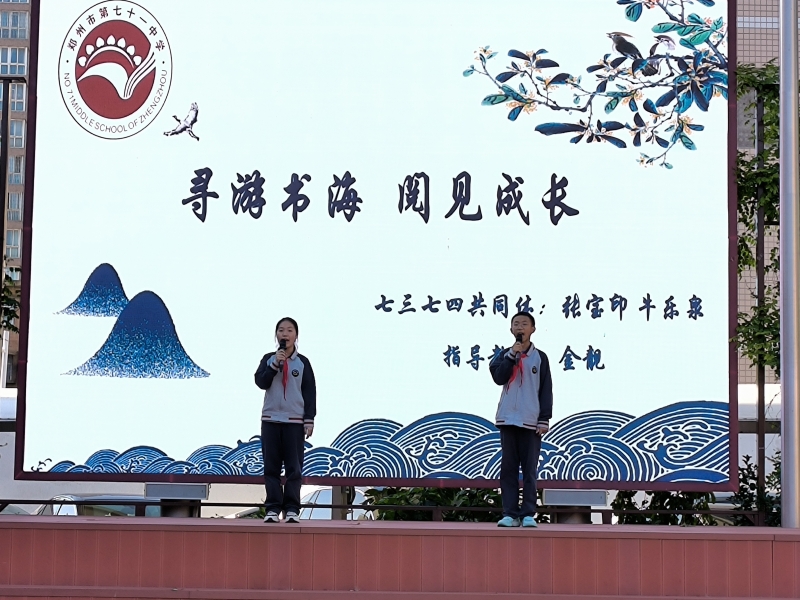 4月23日下午,鄭州市第七十一中學(xué)舉行了“閱讀推動未來”4月讀書“讀誦各科 講評一得”主題活動暨世界讀書日閱讀分享會。學(xué)校黨總支書記徐建志,黨總支副書記、校長孫愛軍,黨總支專職副書記陳廣融,黨總支紀(jì)檢委員副校長吳戰(zhàn)利,黨總支組織委員、副校長趙全發(fā),教務(wù)處主任王潔,政教處主任宋俊美,辦公室主任王冰,及七年級全體師生參加此次活動。