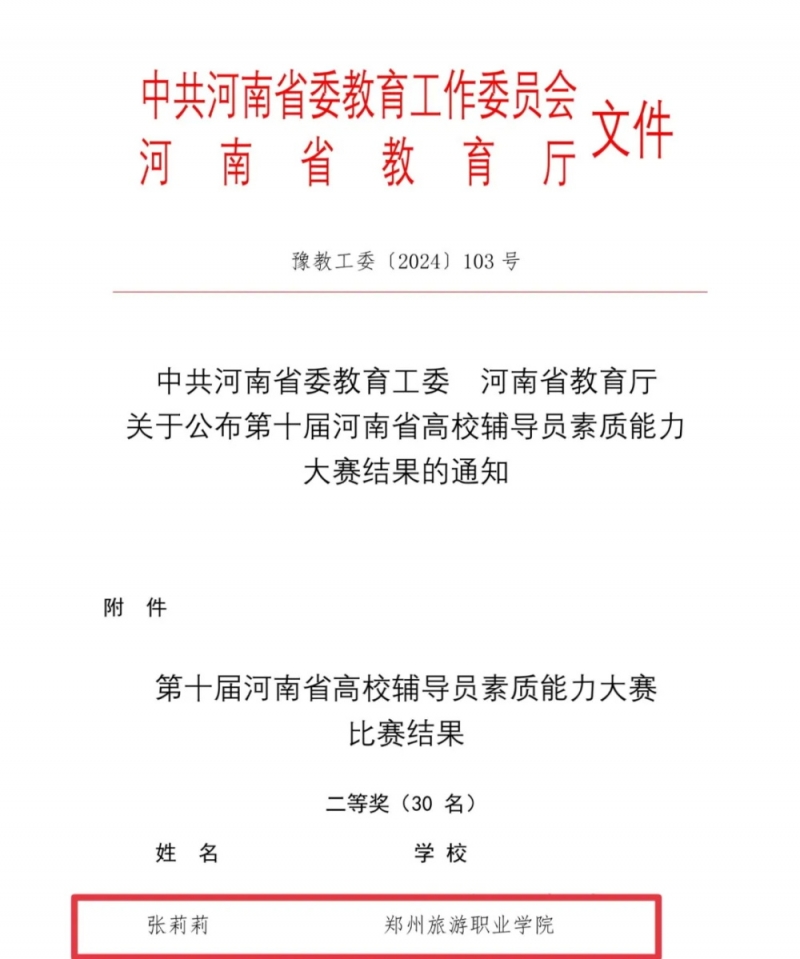 4月23日至24日,由中共河南省委教育工委、河南省教育廳主辦的第十屆河南省高校輔導員素質能力大賽在鄭州航空工業(yè)管理學院順利舉行。經(jīng)過基礎知識測試、案例研討、談心談話三個環(huán)節(jié)的激烈角逐,鄭州旅游職業(yè)學院輔導員張莉莉榮獲二等獎。