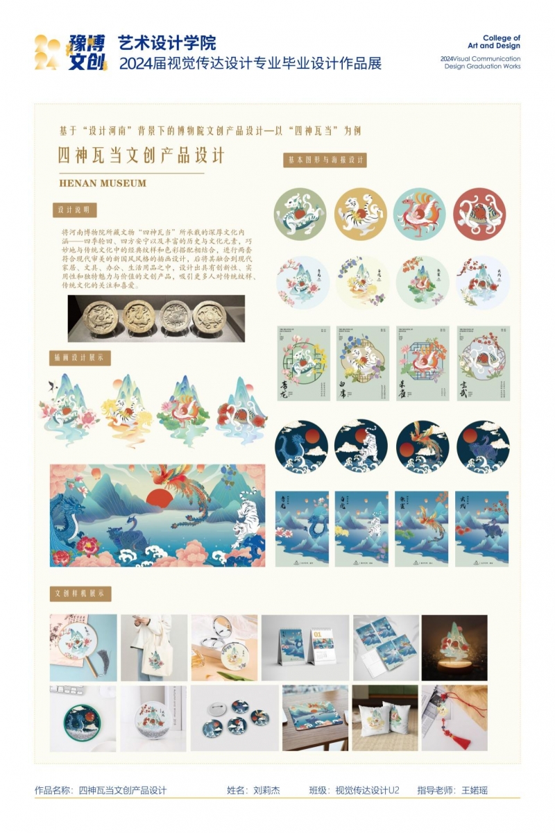 本次畢業(yè)設(shè)計作品展涵蓋了文創(chuàng)產(chǎn)品設(shè)計、品牌形象設(shè)計、IP設(shè)計、包裝設(shè)計、書籍設(shè)計、UI界面設(shè)計等多個方面。其最顯著特點就是緊扣中原文化、圍繞豫博文創(chuàng)板塊選題設(shè)計,獨具匠心展示中原文化的意蘊。“四神瓦當(dāng)”文創(chuàng)產(chǎn)品設(shè)計將河南博物院文物“四神瓦當(dāng)”所承載的四季輪回、四方安寧文化內(nèi)涵,將傳統(tǒng)文化經(jīng)典紋樣與色彩巧妙搭配結(jié)合,進行符合現(xiàn)代審美的新國風(fēng)風(fēng)格插畫設(shè)計,具有創(chuàng)新性、實用性和獨特魅力。“豫想靈瑞”IP形象設(shè)計以河南博物院珍藏的神獸類青銅器為設(shè)計靈感,以神獸類青銅器中的神秘形象和精美紋飾為設(shè)計基調(diào),結(jié)合現(xiàn)代審美和生活需求,創(chuàng)造出獨具特色的文創(chuàng)產(chǎn)品。既尊重歷史傳統(tǒng),又賦予產(chǎn)品新的時代意義。“豫你桐在”IP形象以剪紙效果為主,加以版畫形式的創(chuàng)新,以“焦裕祿精神、蘭考縣、泡桐花”為三大分支進行海報設(shè)計,可以吸引更多年輕人了解蘭考紅色文化和剪紙這一優(yōu)秀國家級非物質(zhì)文化遺產(chǎn)。“豫音裊裊”鄭州方言文創(chuàng)產(chǎn)品設(shè)計以鄭州方言為靈感來源,通過插畫與字體結(jié)合的設(shè)計手法,將這一文化元素融入產(chǎn)品之中,讓更多的人了解和感受到鄭州方言的魅力。“南陽城市”文創(chuàng)產(chǎn)品設(shè)計從動植人物、文化故事、景觀建筑和衣食住行四個方面選出南陽城市兩個區(qū)、十個縣以及一個代管市最具代表性的地域符號進行繪制,形成系列插畫作品,并將其應(yīng)用于種類繁多、形態(tài)各異的文創(chuàng)產(chǎn)品上,既拓寬南陽城市文創(chuàng)的表現(xiàn)形式,又增強了南陽的城市魅力。