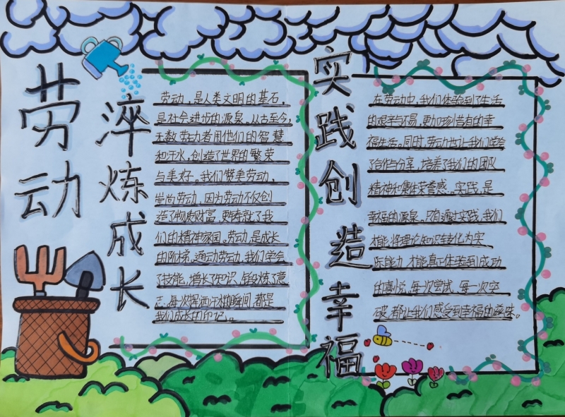 中、高年級的學生利用五一假期,圍繞勞動節(jié)主題搜集節(jié)日的起源、節(jié)日意義等方面的知識,用優(yōu)美的文字、合理巧妙的編排設計,詮釋勞動節(jié)的意義,創(chuàng)作出內容豐富、形式多樣的手抄報作品。