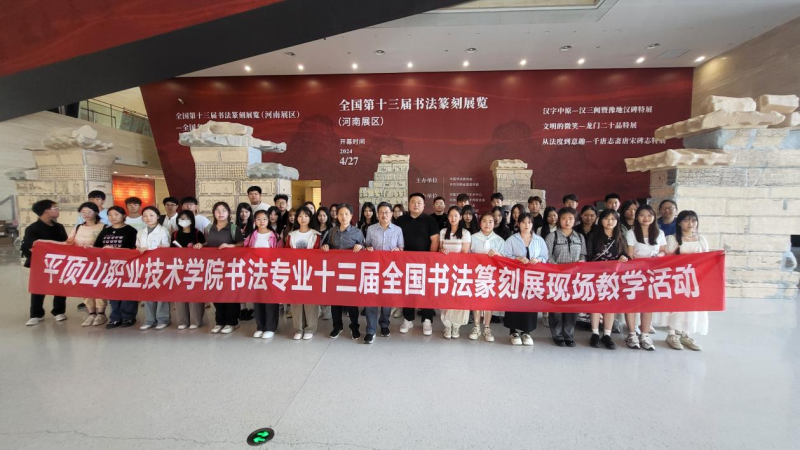 5月10日,平頂山職業(yè)技術(shù)學(xué)院美術(shù)系組織校外教學(xué)觀摩活動(dòng),由系主任軒一心帶隊(duì),美術(shù)系2022、2023級(jí)書畫專業(yè)的50同學(xué)赴鄭州美術(shù)館(新館),觀摩學(xué)習(xí)全國(guó)第十三屆書法篆刻展(河南展區(qū))。
