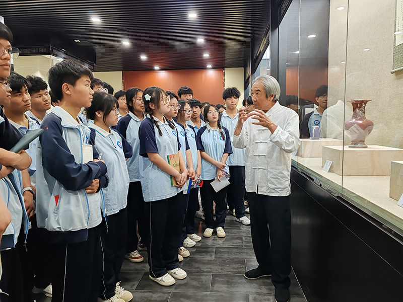 “鈞瓷始于唐、盛于宋,以其獨特的釉料及燒成方法產(chǎn)生的窯變神奇而聞名于世,也只有禹州能夠燒制出出窯萬彩、渾然天成的鈞瓷……”“近年來許多鈞瓷精品作為國禮贈送給普京等各國政要,為推進世界和平交流發(fā)揮重要作用……”5月13日,在禹州市星航鈞瓷燒制技藝傳習館,國家級非物質(zhì)文化遺產(chǎn)項目鈞瓷燒制技藝代表性傳承人、中國工藝美術(shù)大師任星航結(jié)合館內(nèi)陳列的精美鈞瓷作品,為在場師生講述起禹州的鈞瓷故事。