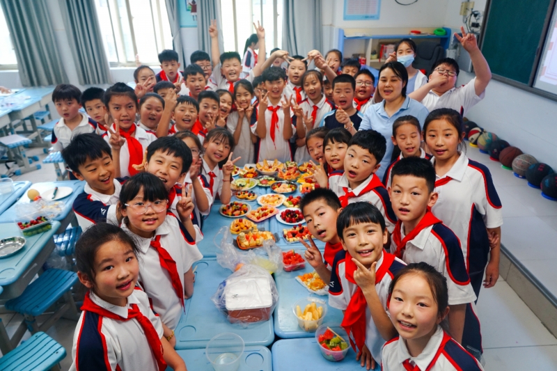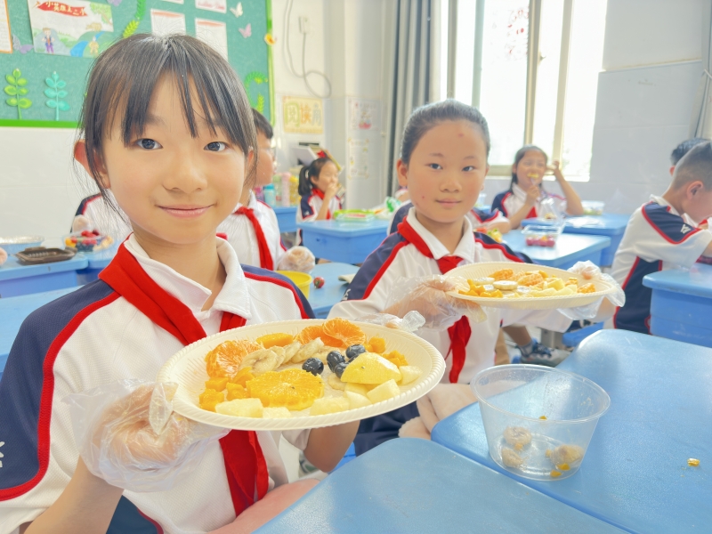 隨著水果拼盤比賽項目的開始,三年級的同學(xué)們迫不及待地拿出食材,拿起水果刀、小叉子開始剝皮、切塊、穿插、擺盤,整個過程一氣呵成,各種果蔬搖身一變,成為了一件件精致的“藝術(shù)品”。
