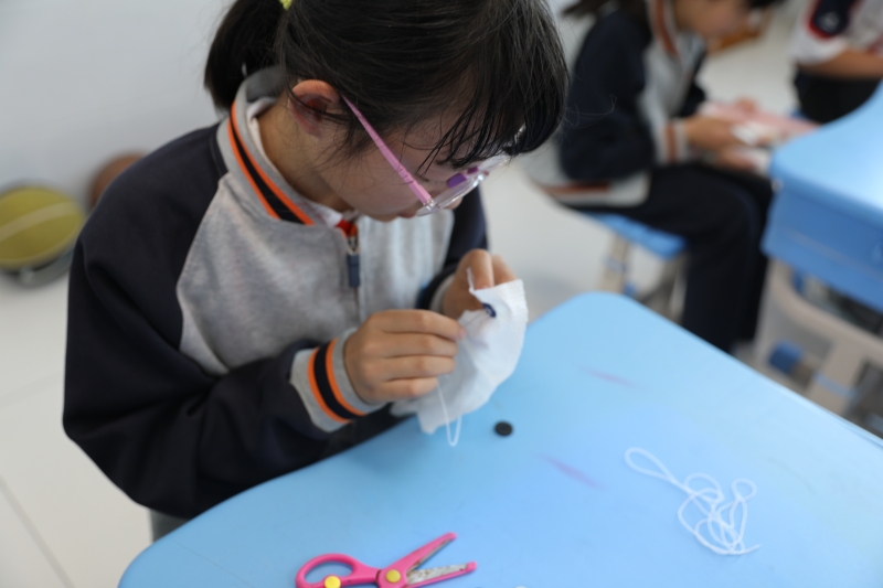 四年級的小選手們小心翼翼地穿針引線,一手拿著扣子,一手拿著針線,穿針、釘扣子、打結(jié),十分嫻熟。一時間只見銀針穿梭,彩線翻飛,一雙雙巧手將扣子牢牢釘在衣服上。整場比賽扣人心弦,精彩紛呈。