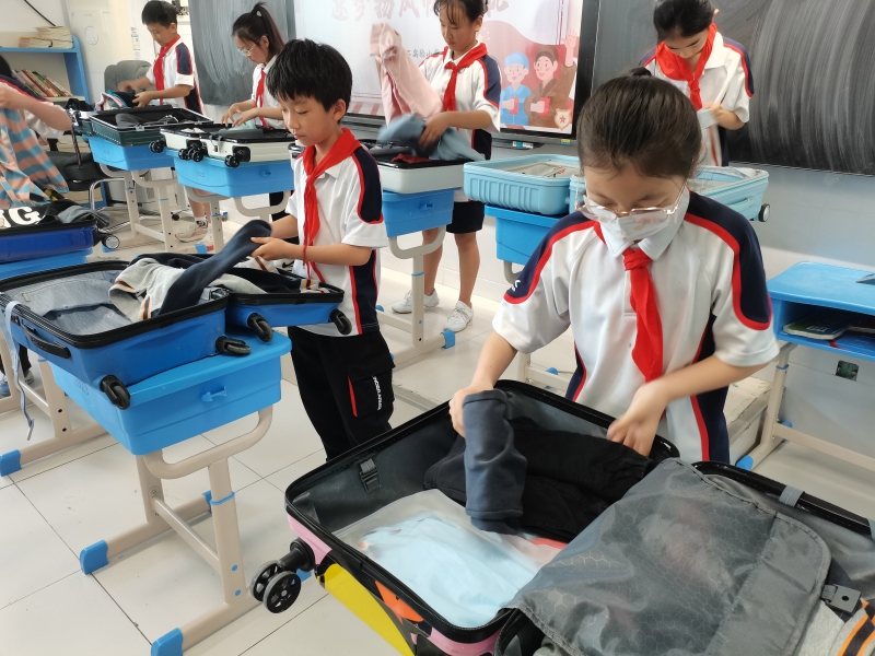 衣服上的頑垢如何清洗?五年級的同學(xué)們各有妙招,他們用小蘇打、爆炸鹽、洗衣液對付衣服頑垢,將臟衣服變得嶄亮如新,贏得陣陣喝彩。除此之外,還開展了疊雨衣、摘韭菜、整理行李箱、做涼拌菜、制作營養(yǎng)早餐、展示家電使用技能等多個勞動項目的精彩比賽。