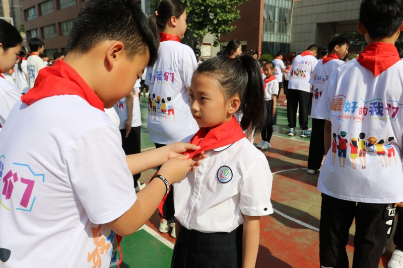 老隊員們?yōu)樾玛爢T們佩戴上鮮艷的紅領(lǐng)巾,新隊員們的臉上洋溢著自豪與喜悅。他們在隊旗下莊嚴宣誓,稚嫩而堅定的聲音回蕩在校園上空。