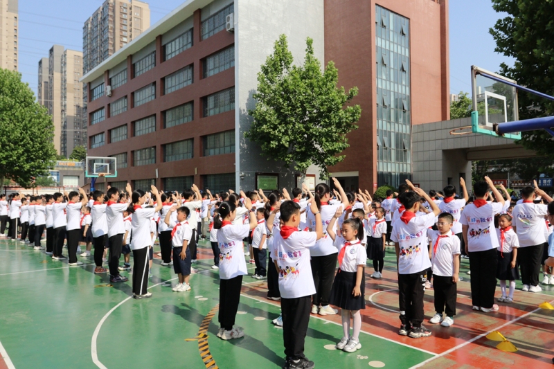 5 月22日,鄭州市金水區(qū)鳳凰雙語小學的校園里充滿了莊重而歡樂的氣氛,一年級分批入隊儀式在這里隆重舉行。在嘹亮的隊歌聲中,入隊儀式拉開帷幕。一年級的同學們懷著激動與期待的心情,整齊地站立在操場上。首批一年級小朋友們光榮地加入了中國少年先鋒隊。