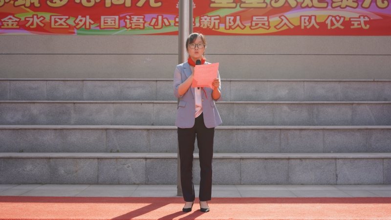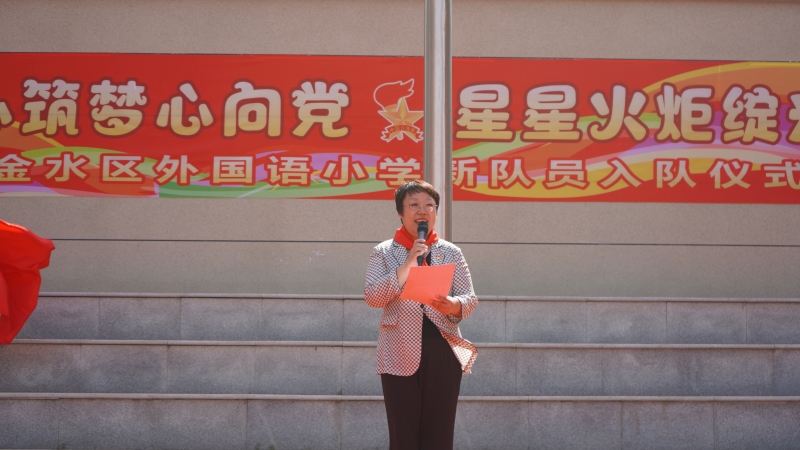 金水區(qū)外國(guó)語(yǔ)小學(xué)少工委主任、書(shū)記、校長(zhǎng)邵玉慧向新隊(duì)員們表示祝賀,她殷切地希望新隊(duì)員們嚴(yán)格要求自己,樹(shù)立遠(yuǎn)大志向、培育美好心靈,為胸前鮮艷的紅領(lǐng)巾增光添彩;希望中隊(duì)輔導(dǎo)員們能做少先隊(duì)員最親密的朋友和指導(dǎo)者,為黨育人,為國(guó)育才。
