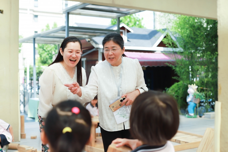 專家和各位園長們跟隨孩子們的腳步,走進幼兒戶外自主游戲,深入體驗孩子們的“真”游戲。幼兒在游戲中體現(xiàn)出的自主、專注、探索、嘗試、堅持、不放棄的學習品質,感染著在場觀摩的每一位幼教同仁,大家紛紛駐足觀察、交流,在觀察中傾聽幼兒,親身感受自主游戲帶給幼兒的快樂,更深層領悟自主游戲的獨特價值。
