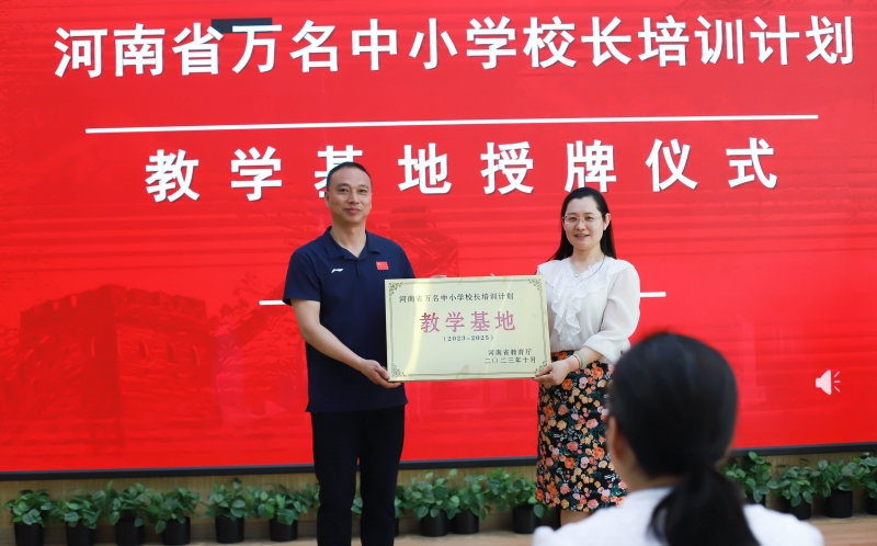 戶外觀摩結束后,河南省萬名中小學培訓計劃項目辦公室學員管理部負責人吳雙喜為鄭州市金水區(qū)第一幼兒園教育集團授予“河南省萬名中小學校長培訓計劃教學基地”的稱號。