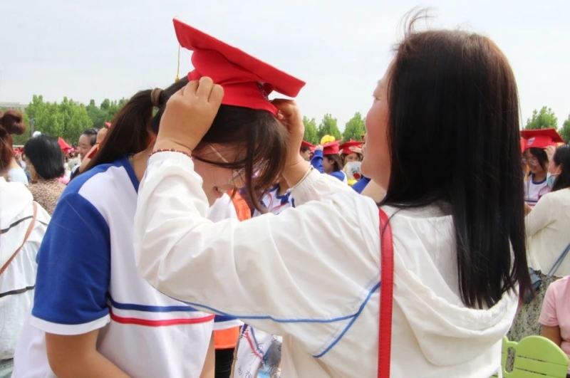 成人禮儀式上,家長(zhǎng)為孩子冠戴“成人帽”,舉行撥穗禮。全體學(xué)生誦讀成人禮誓詞,挽著父母,在老師的陪伴和祝福下,跨越“成人門”,翻開“新篇章”。