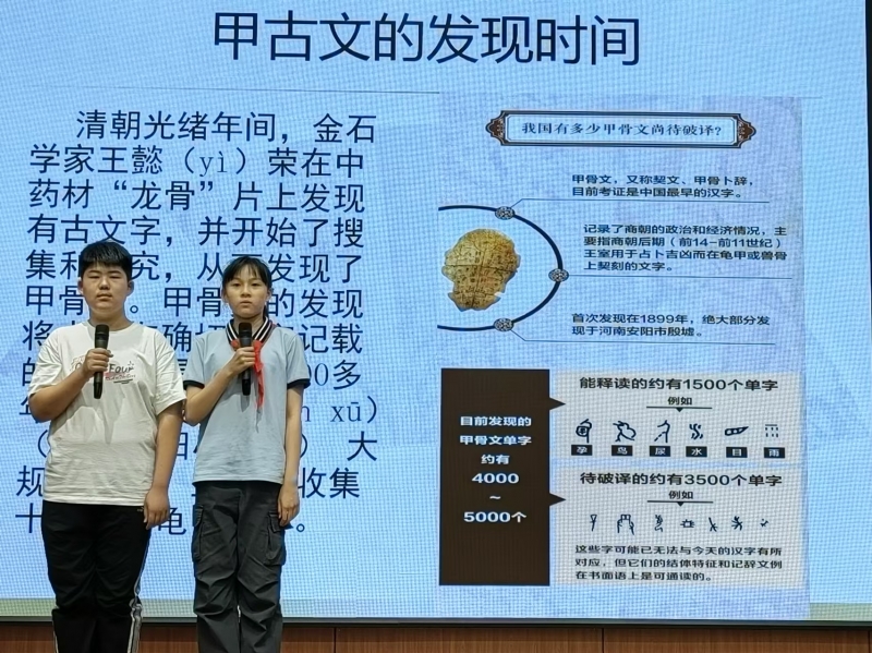 在成果展示現(xiàn)場,學(xué)生們展示了豐富多彩的研究成果。他們通過PPT匯報、現(xiàn)場解說等方式介紹了“河南非遺文化風(fēng)箏”“河南各朝代國土面積”“河南的錢幣發(fā)展歷史”“河南茶文化”等30多個主題研究活動。