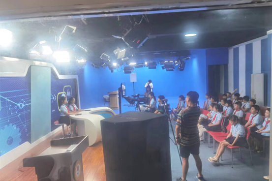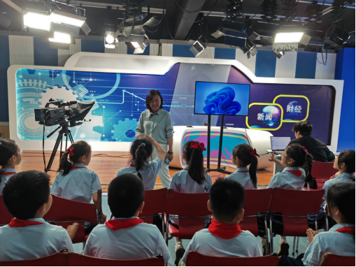 在活動(dòng)現(xiàn)場(chǎng),信陽(yáng)職業(yè)技術(shù)學(xué)院語(yǔ)言與傳媒學(xué)院學(xué)生黨支部?jī)?yōu)秀黨員帶領(lǐng)小學(xué)生們參觀了融媒中心演播廳,了解了廣播電視節(jié)目的制作流程。
