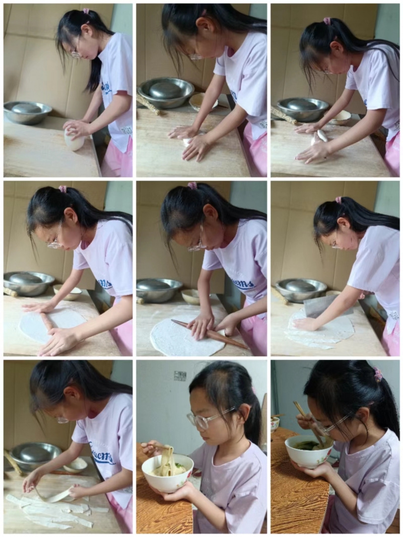 五六年級的同學走出學校,走進田野,參與收曬小麥的農事活動。收獲的小麥制成面粉,同學們親身實踐,和面、揉面、醒面、搟面,將薄薄的面餅切成寬窄均勻的面條,金黃的麥粒,變成了美味面食。