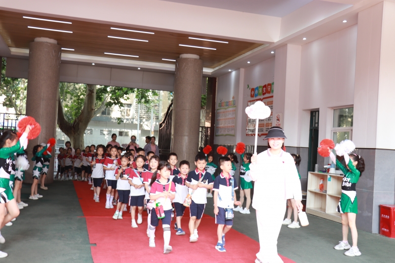 一路上,孩子們興奮不已,懷著強(qiáng)烈的好奇心來到了鄭州市文化路第二小學(xué)。一首歡快的《向快樂出發(fā)》迎接幼兒們的到來,孩子們走過紅毯,陽光活力的啦啦操隊(duì)員們?cè)趦蓚?cè)用歡快的舞蹈向孩子們熱情的招手歡迎!學(xué)校黨總支書記弓書玉、校長(zhǎng)丁戈軍及全體班子成員在門口迎接,學(xué)校少先隊(duì)大隊(duì)干部熱情接待,儀式感滿滿!