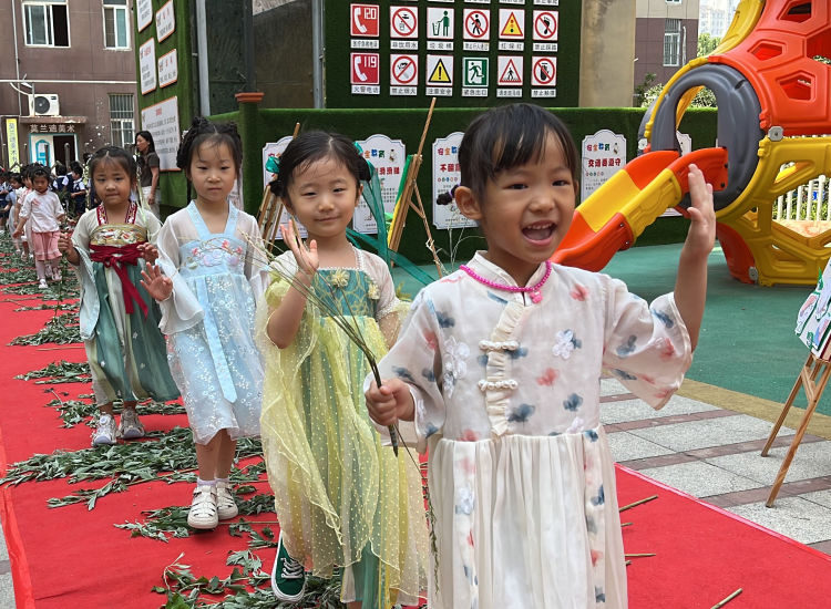 “艾”之路上,幼兒身著漢服,腳踩鋪滿艾草的紅毯入園,寓意健健康康百毒不侵。