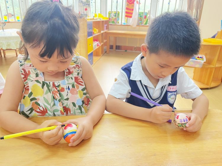 端午節(jié)畫彩蛋寓意“逢兇化吉、平安圓滿”,幼兒把五彩繽紛的顏料點(diǎn)綴在蛋殼上,讓一個(gè)個(gè)蛋殼生動(dòng)起來。