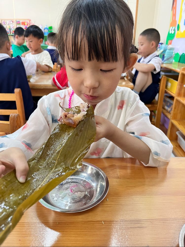 如此佳節(jié),當(dāng)然少不了粽子。箬葉散發(fā)著清香,咬一口粽子,鮮香綿軟而不膩味,既是消暑開胃的美食,又是營(yíng)養(yǎng)美味的佳品。孩子們?cè)谟變簣@一起分享美味的粽子。