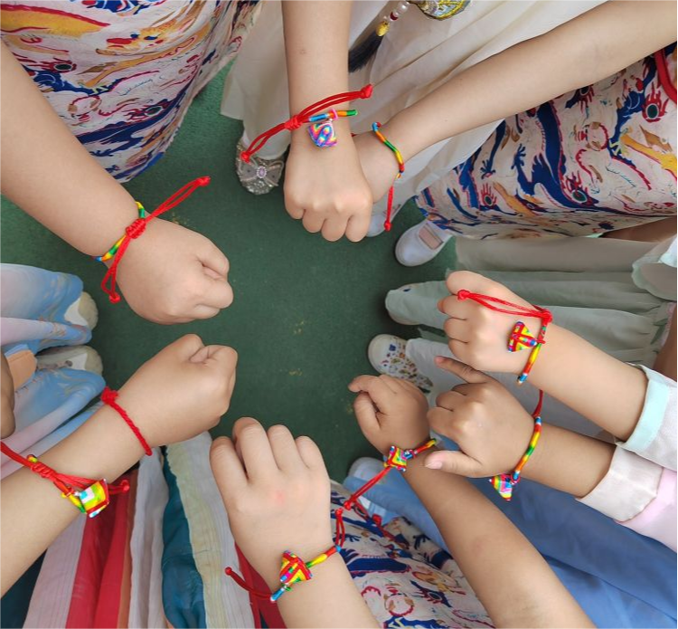 五彩繩是端午節(jié)的吉祥物兼飾物,具有祈福納吉的作用,教師給幼兒佩戴五彩繩。